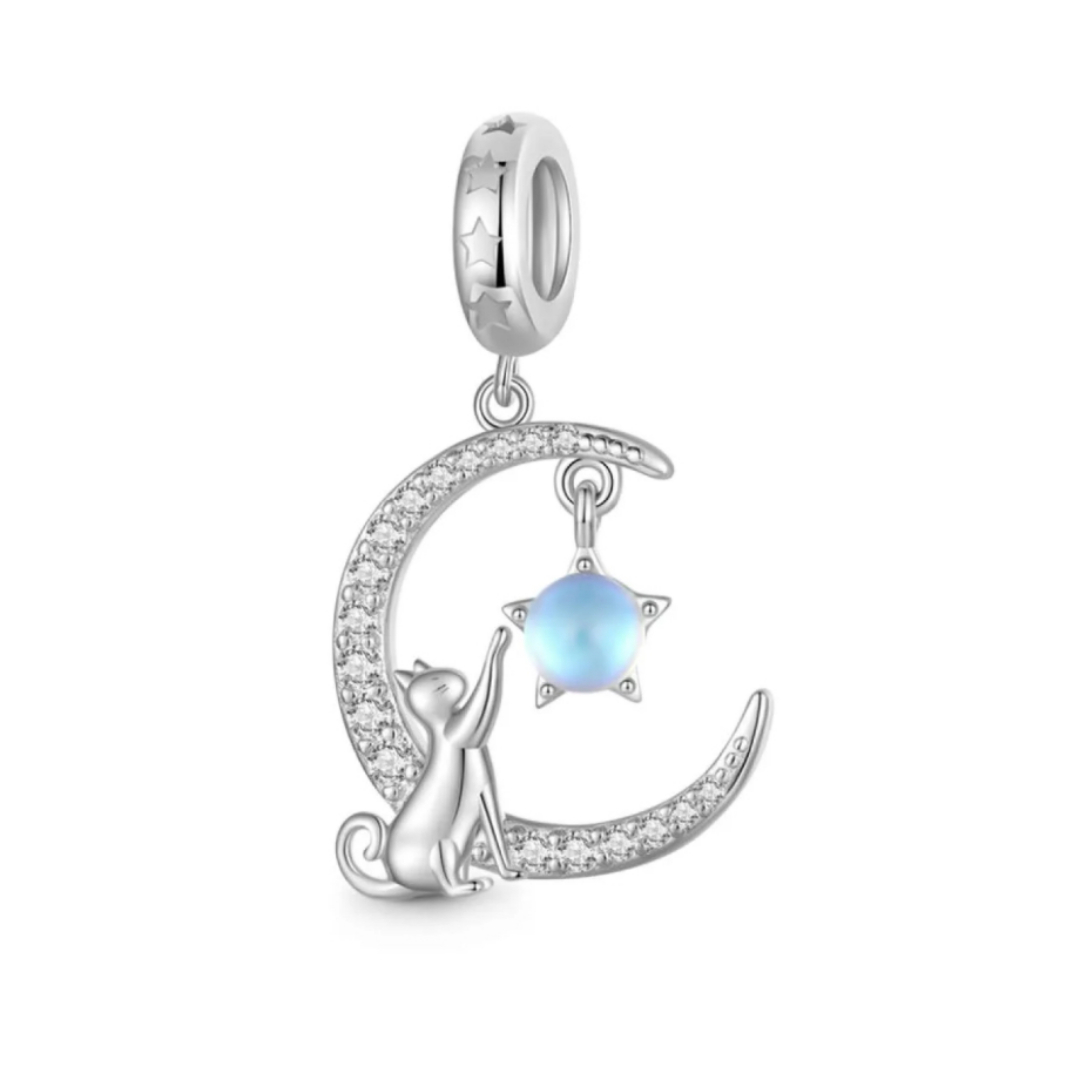 Encante-se com o charme do Berloque Gatinho na Lua, uma peça delicada e cheia de significado. O design traz um gatinho brincando com um pequeno pendente em cristal azul, suspenso sobre uma meia-lua elegante, representando leveza, curiosidade e ternura.