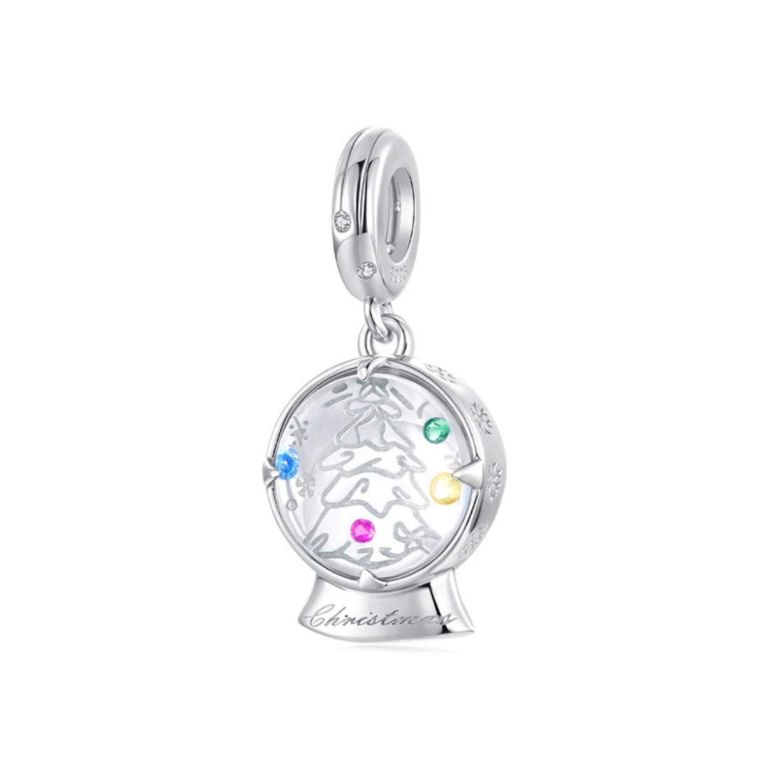 Berloque pendente delicado em formato de globo de neve, com uma árvore de Natal desenhada em seu interior e floquinhos de neve ao redor, transmitindo toda a magia e encanto da época natalina. Uma peça encantadora, perfeita para quem ama o clima de Natal e os pequenos detalhes cheios de significado.
