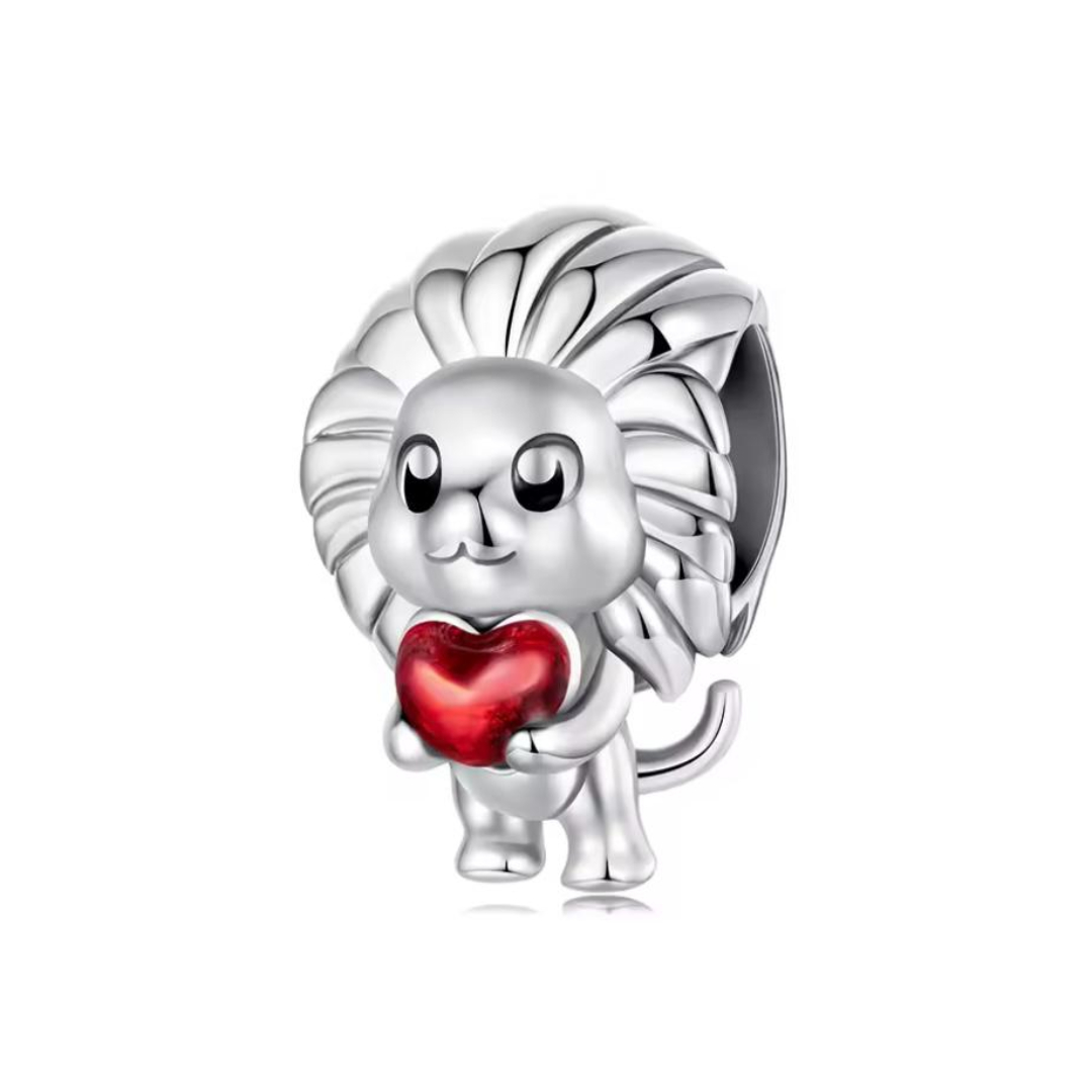 Berloque em formato de leão confeccionado em prata, com acabamento polido e detalhes esmaltados. A peça apresenta um design delicado, onde o leão segura um coração vermelho, simbolizando amor, força e coragem. Ideal para pulseiras, adicionando um toque de personalidade e elegância à coleção.