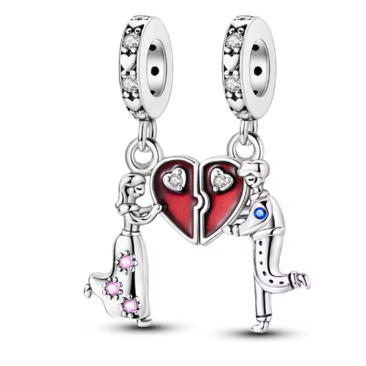 Detalhes: Um charme cheio de significado! Esse lindo berloque em Prata traz a figura de um casal apaixonado, cada um segurando metade de um coração vermelho esmaltado, simbolizando união e amor verdadeiro. Detalhes delicados, como flores com pedra de zircônia rosa no vestido da menina e pedrinha azul na roupa do menino, tornam a peça ainda mais especial.