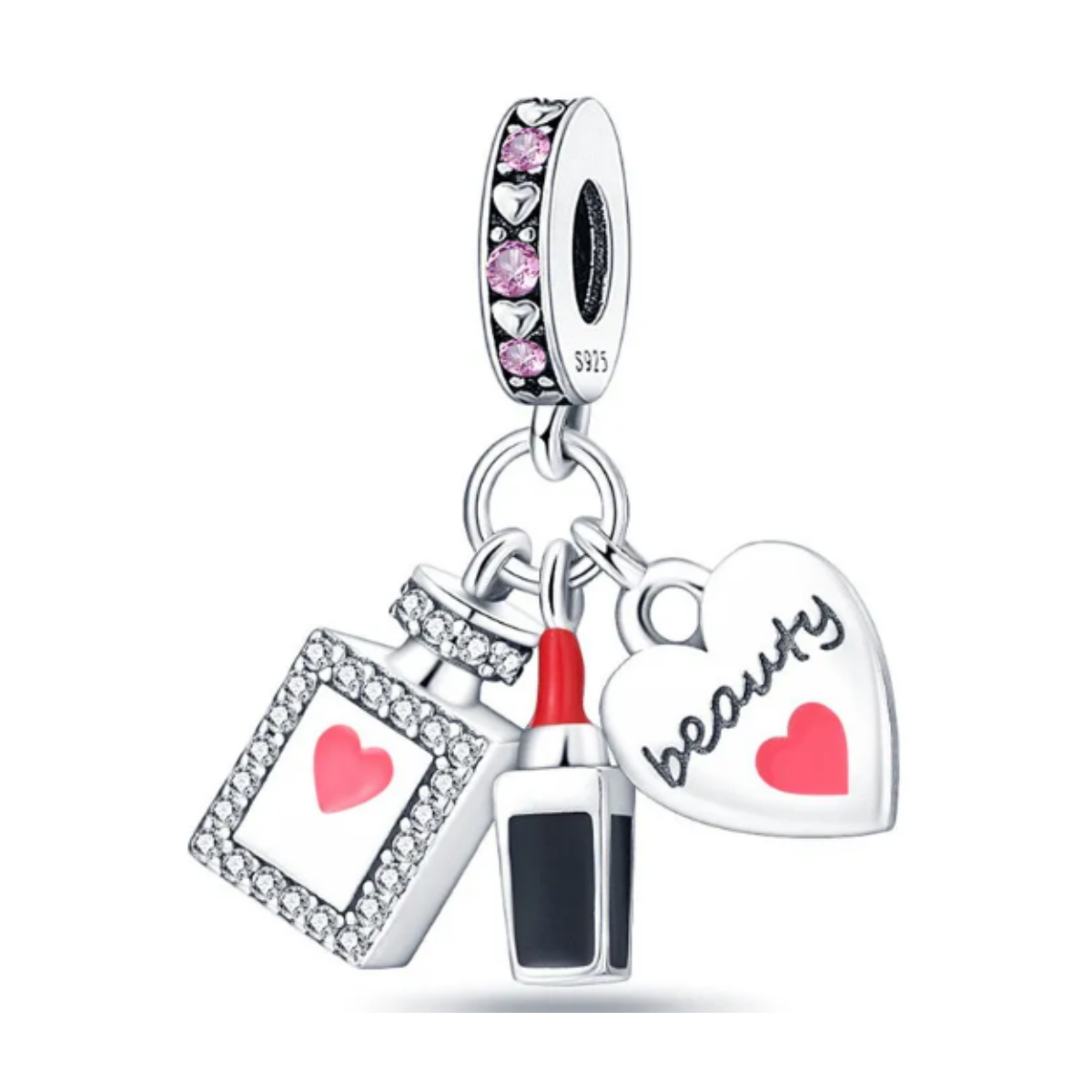 Detalhes: Berloque em Prata 700 com três charms delicados: um frasco de perfume cravejado, um batom esmaltado em vermelho e preto e um coração com a palavra “beauty” e detalhe em vermelho. A base é decorada com corações e zircônias rosas, trazendo charme e feminilidade à peça.