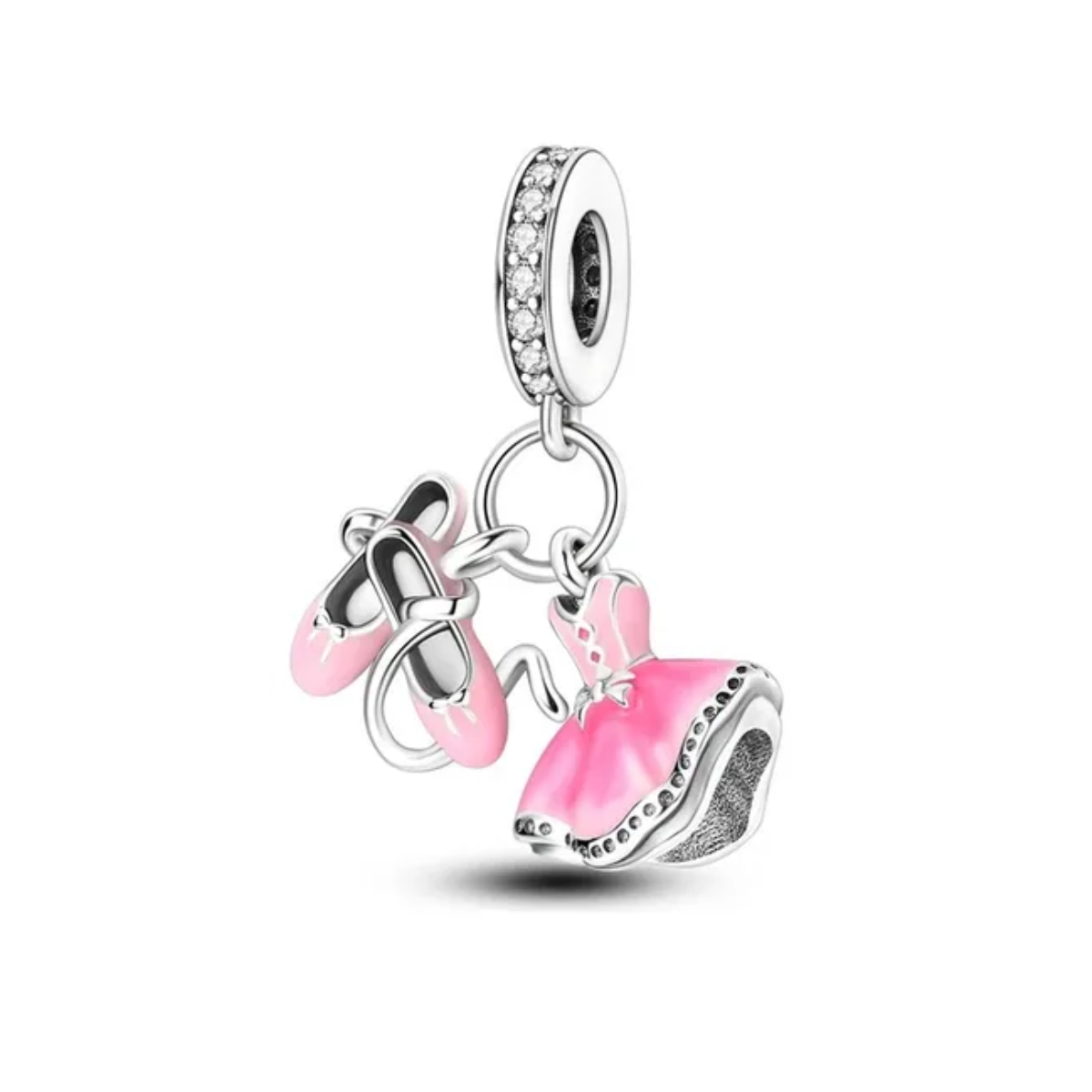 Detalhes: Um charme delicado e cheio de graça! Esse berloque em Prata traz dois pendentes encantadores: um vestido de balé e um par de sapatilhas esmaltadas em rosa, símbolos de leveza, dedicação e paixão pela dança. O aro é detalhado com zircônias brilhantes, que dão um toque de elegância e sofisticação à peça.