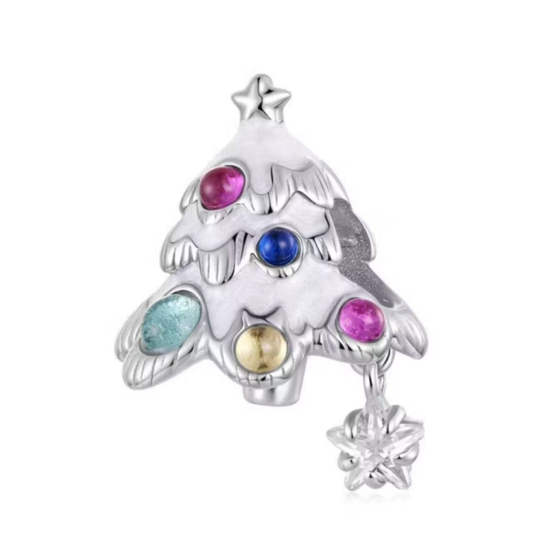 Berloque separador em formato de árvore de Natal, com esmaltagem branca e detalhes de bolinhas coloridas, que remetem aos enfeites típicos da época. A peça é finalizada com um delicado pendentinho de estrelinha, adicionando um toque de brilho e encanto.