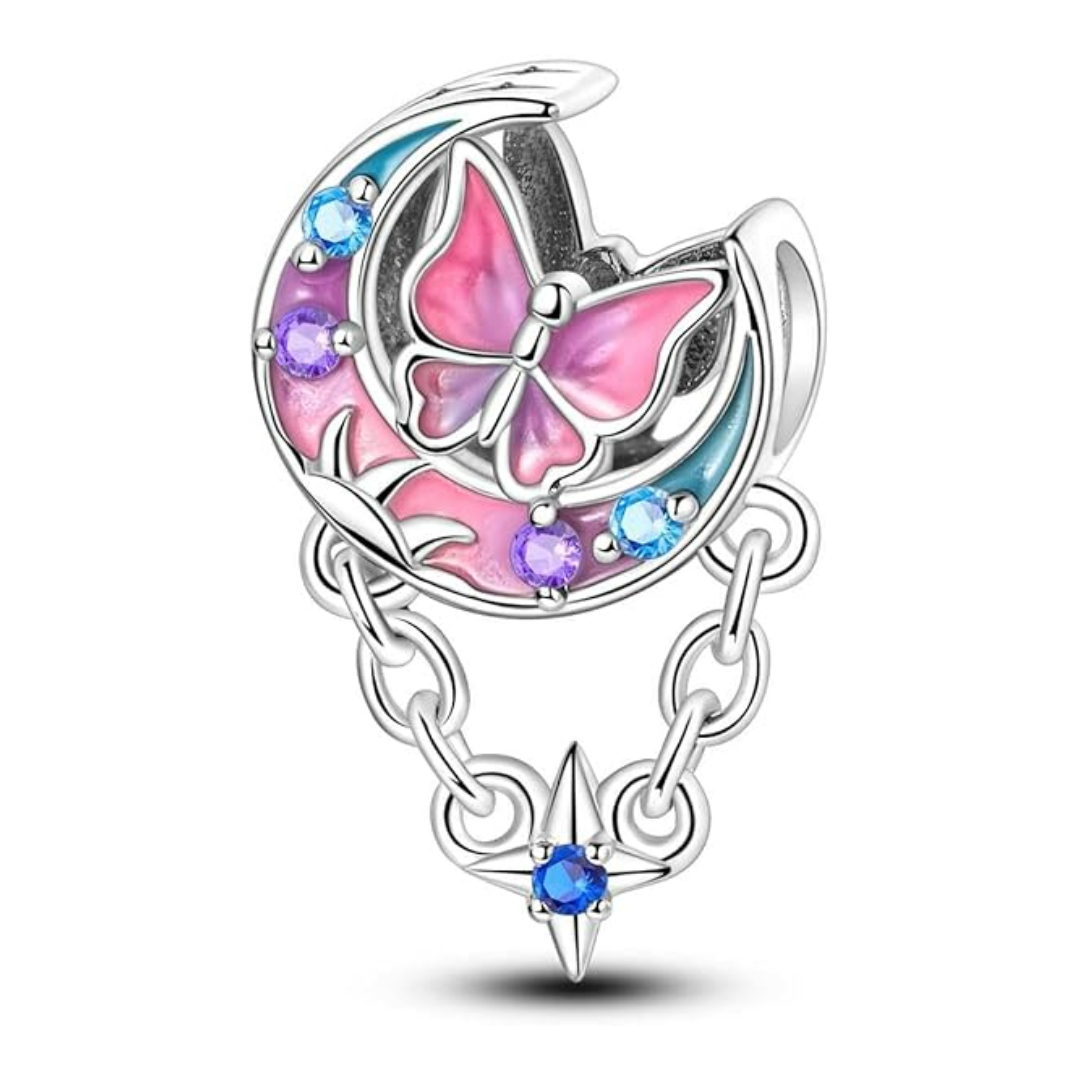 Berloque design encantador de borboleta e lua crescente, com pedras em tons de lilás e azul. Possui corrente delicada com pequeno detalhe de estrela, simbolizando leveza, transformação e proteção. Uma peça elegante e cheia de significado, ideal para compor pulseiras com toque de delicadeza e brilho.
