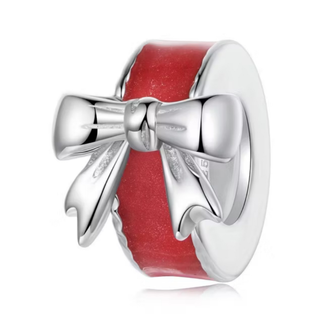 Berloque stopper em formato de lacinho de Natal, um modelo delicado e funcional que une beleza e praticidade. A peça possui silicone interno, que garante melhor fixação na pulseira, evitando que os demais berloques deslizem.