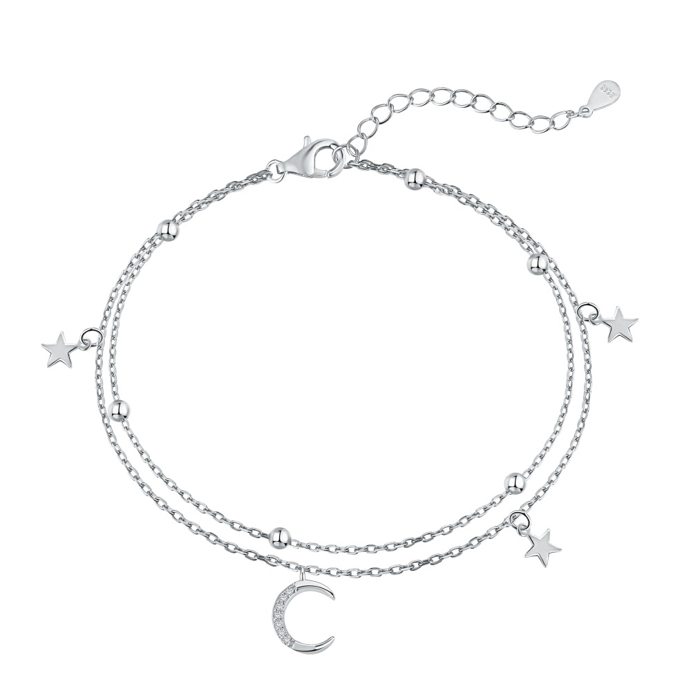 A Pulseira Duplo Fio Lua e Estrelas em Prata 925 combina delicadeza e brilho em um design moderno e cheio de significado. Composta por dois fios paralelos que trazem leveza e elegância, ela destaca pingentes de lua e estrelas, símbolos de luz, proteção e feminilidade.