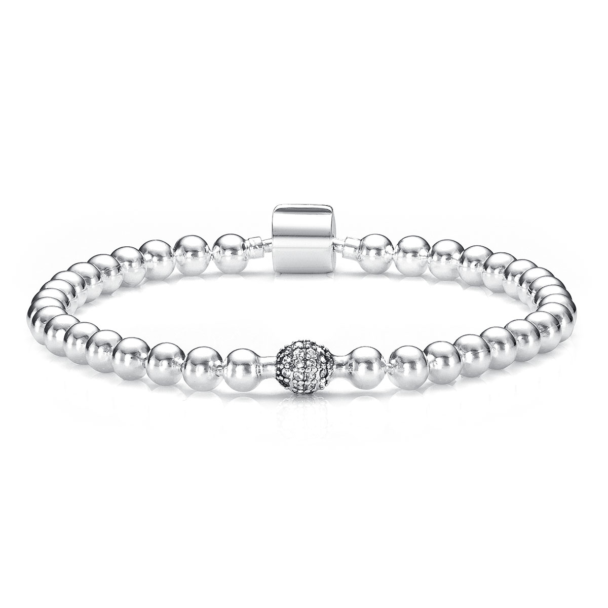 Corpo da pulseira produzido em bolinhas resistentes e fio de prata que passa por dentro das contas.