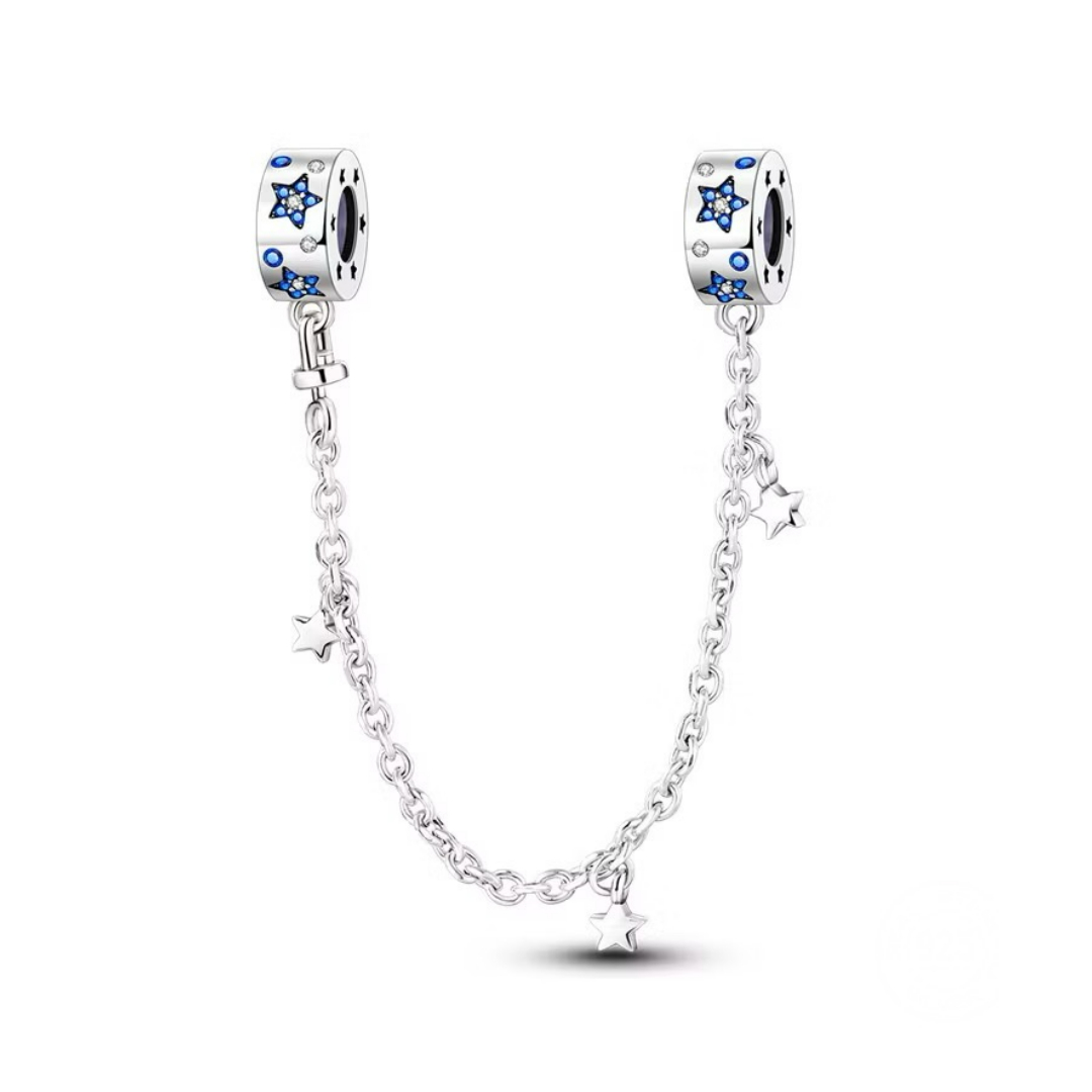 Trava de corrente de segurança elegante e funcional, inspirada no céu noturno, com detalhes de estrelas gravadas na base e um delicado pingentinho de estrelinhas que acrescenta charme e sofisticação à pulseira.